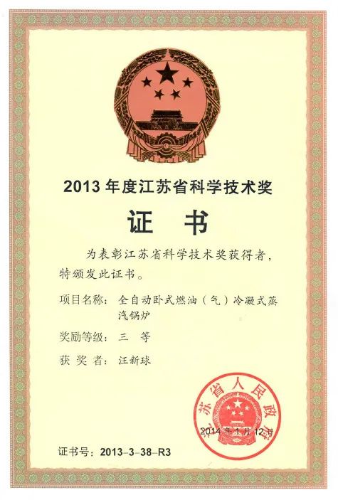 汪新球主導(dǎo)研發(fā)的臥式冷凝鍋爐獲得了江蘇省科技進(jìn)步三等獎(jiǎng)。